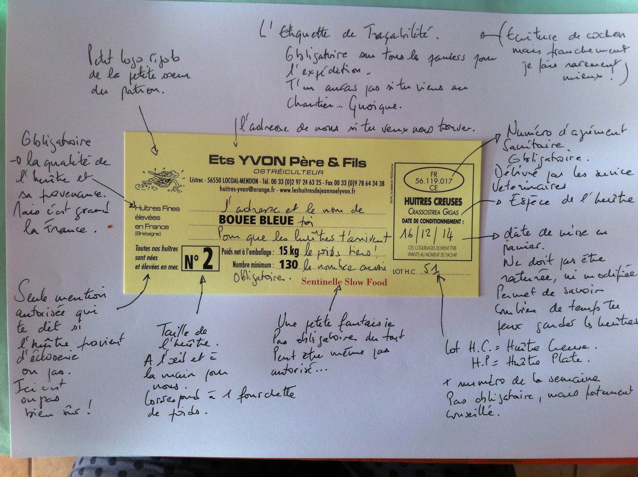 Ces mentions sont obligatoires (pas celle du blog!) tout comme celles dans le cadre à droite, qui est le numéro d’agrément sanitaire, délivré par les services vétérinaires, oui, les huîtres sont des animaux comme les autres.