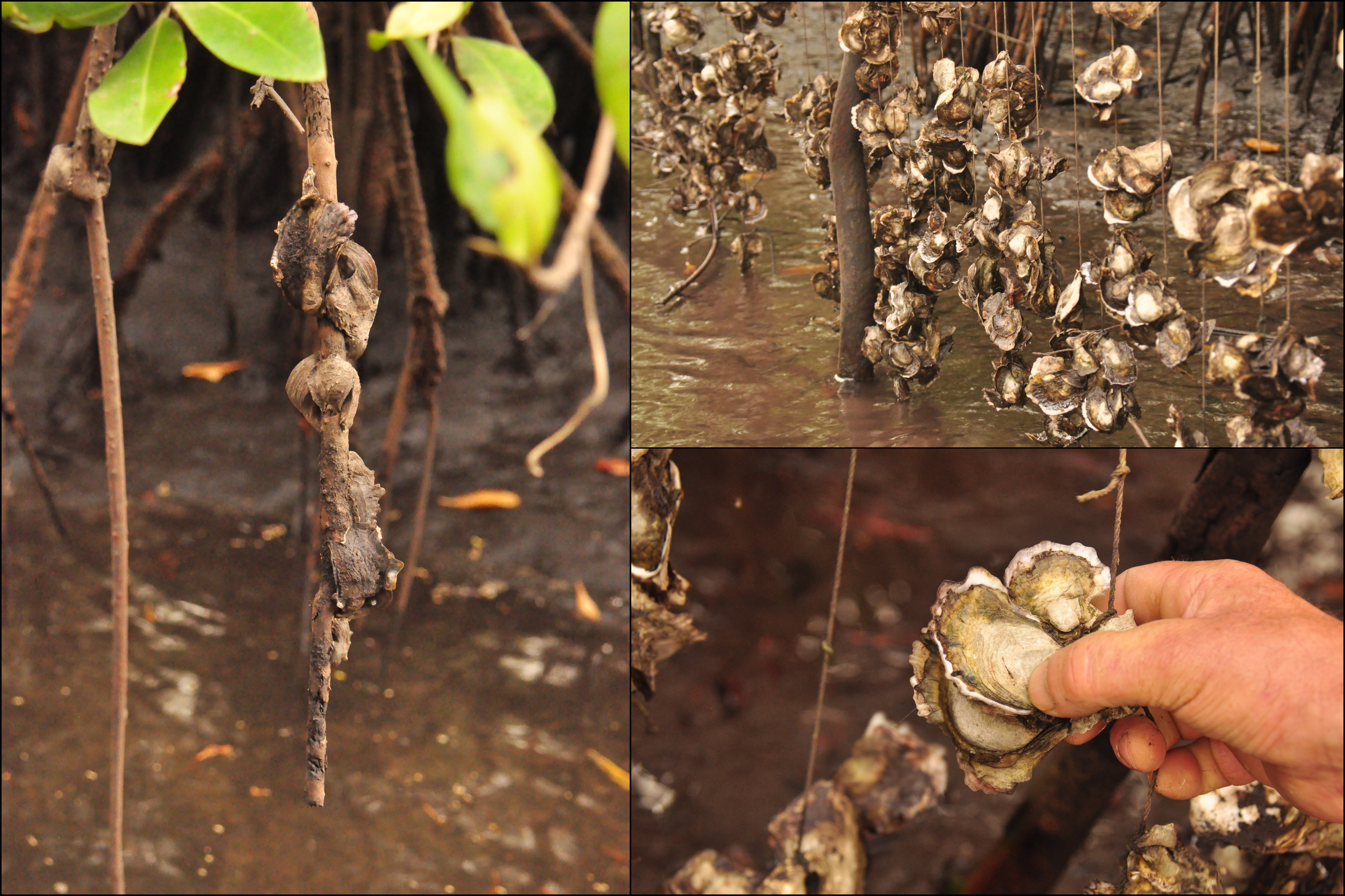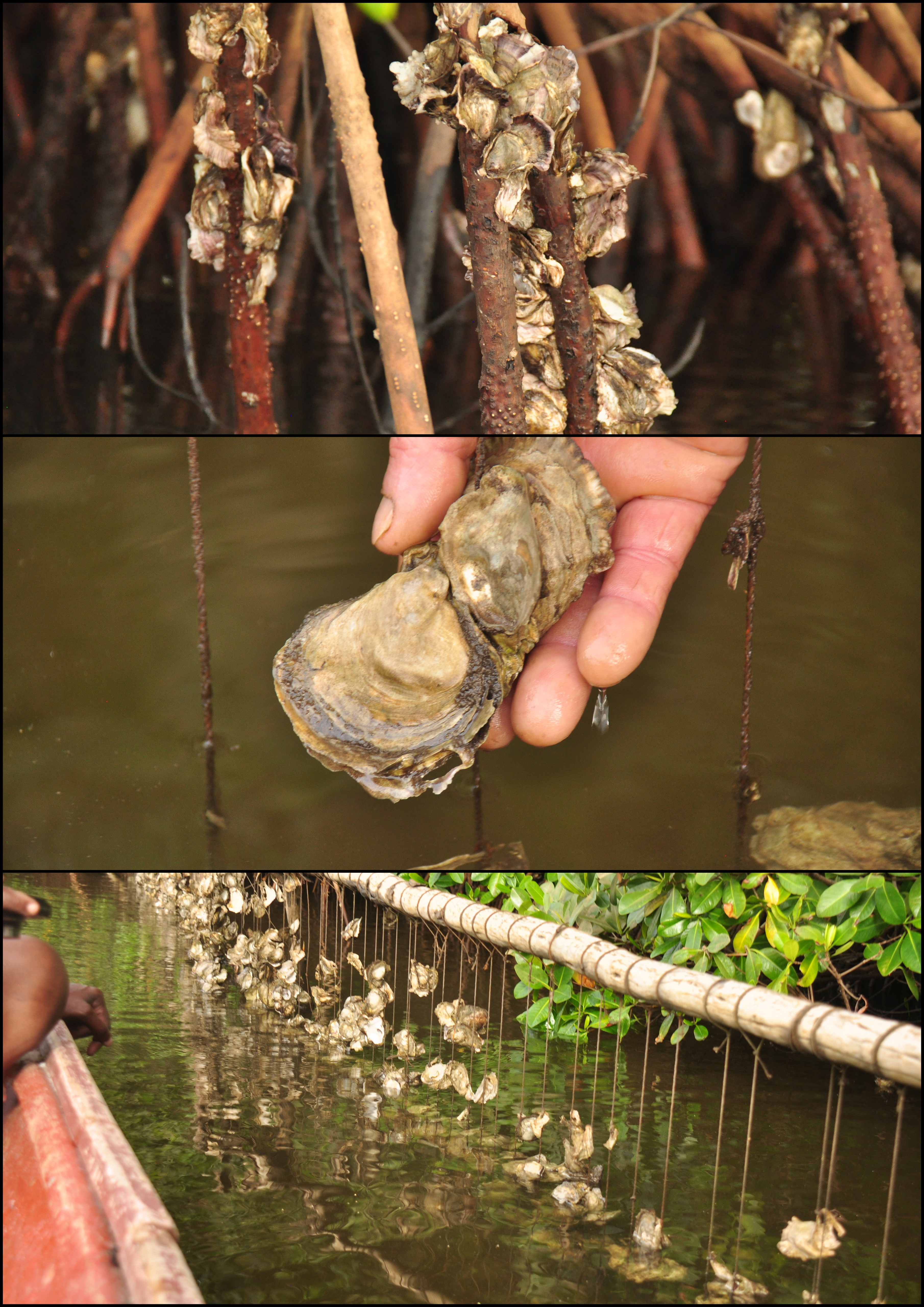 Mais nous constatons ce que nous verrons aussi dans les deux autres villages que nous visiterons après, que la pose des guirlandes a entraîné une repopulation des huîtres de mangroves sur les racines de palétuviers. Partout, du captage, là où on n’en voyait pas jusqu’alors. Le programme est visiblement porteur.