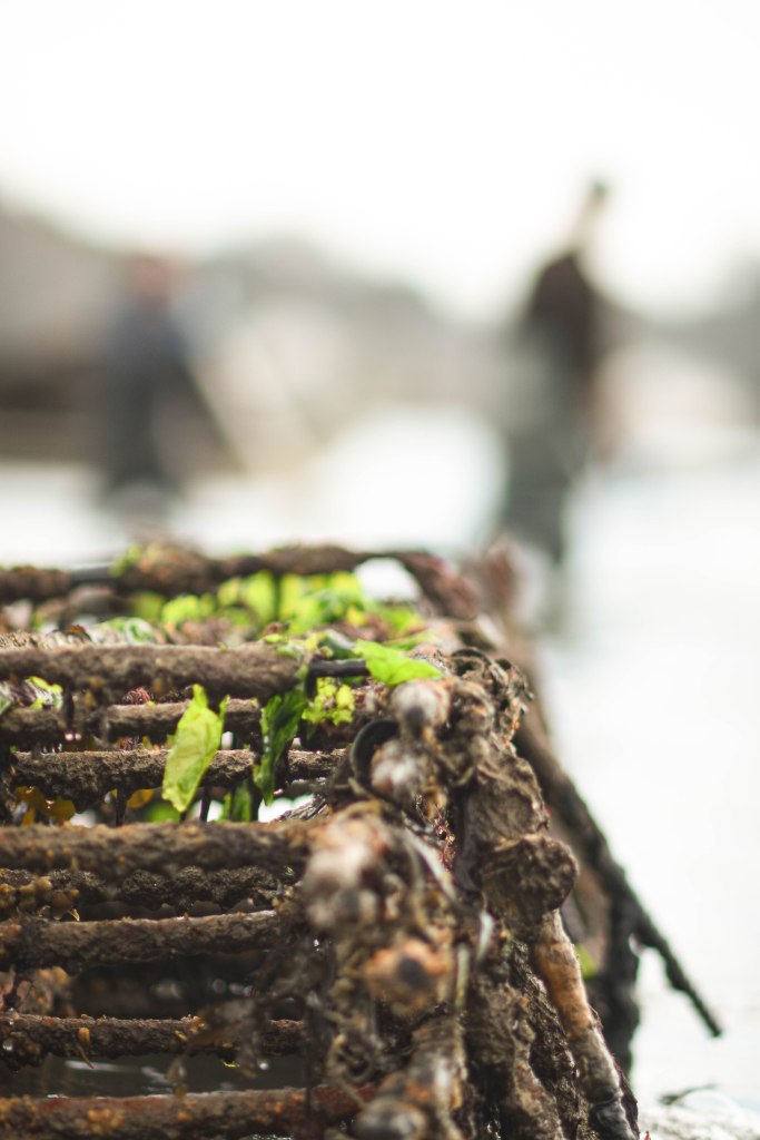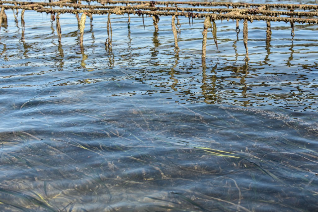 Cela dit, les herbiers de zostères sont indispensables à la qualité d’eau et la biodiversité. Notre action sur leur prolifération est ponctuelle (une fois tous les 5 ou 6 ans) et localisée. Nous laissons un espace très grand entre les rangées de tables (la largeur du chaland et deux bipèdes, soit environ 6 grands pas) sur ce parc où les zostères reviennent régulièrement, ce qui permet aux un de travailler mieux, plus longtemps, et aux autres de retrouver leur place sereinement.