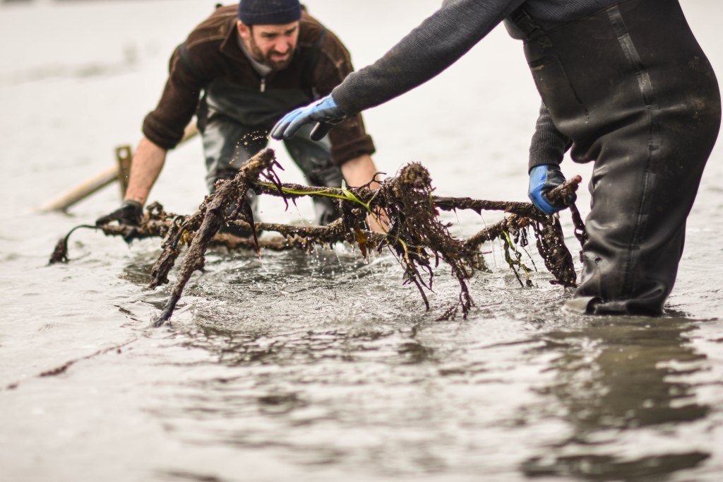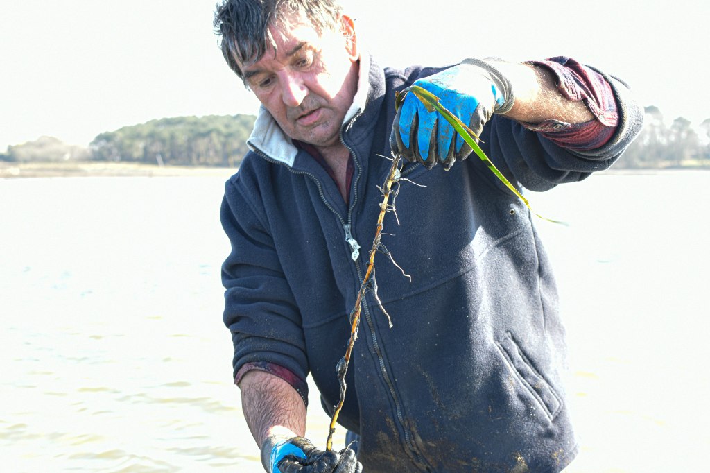 Seulement, la période où les tables sont presque toutes vides est le moment idéal pour remplacer les tables usagées, mais surtout, de les déplacer, là où la sédimentation a été forte, aidée par la prolifération de zostères, ces plantes qui se développent dans la vase et la retiennent, élevant un peu plus haut chaque année le niveau du sol, donnant l’impression que les tables s’enterrent. Vois cette plante marine que Jean Noël présente : entre ses deux mains, la racine, soit la hauteur de sédimentation, en quelques années seulement. Imagine cette hauteur de vase sur un pied de table : cela enlève facilement 30 à 40 centimètres sur la hauteur de travail que nous avons. Notre dos le sait bien. Quant à nos genoux, ils apprécient peu la torsion que l’on impose pour dégager la botte.