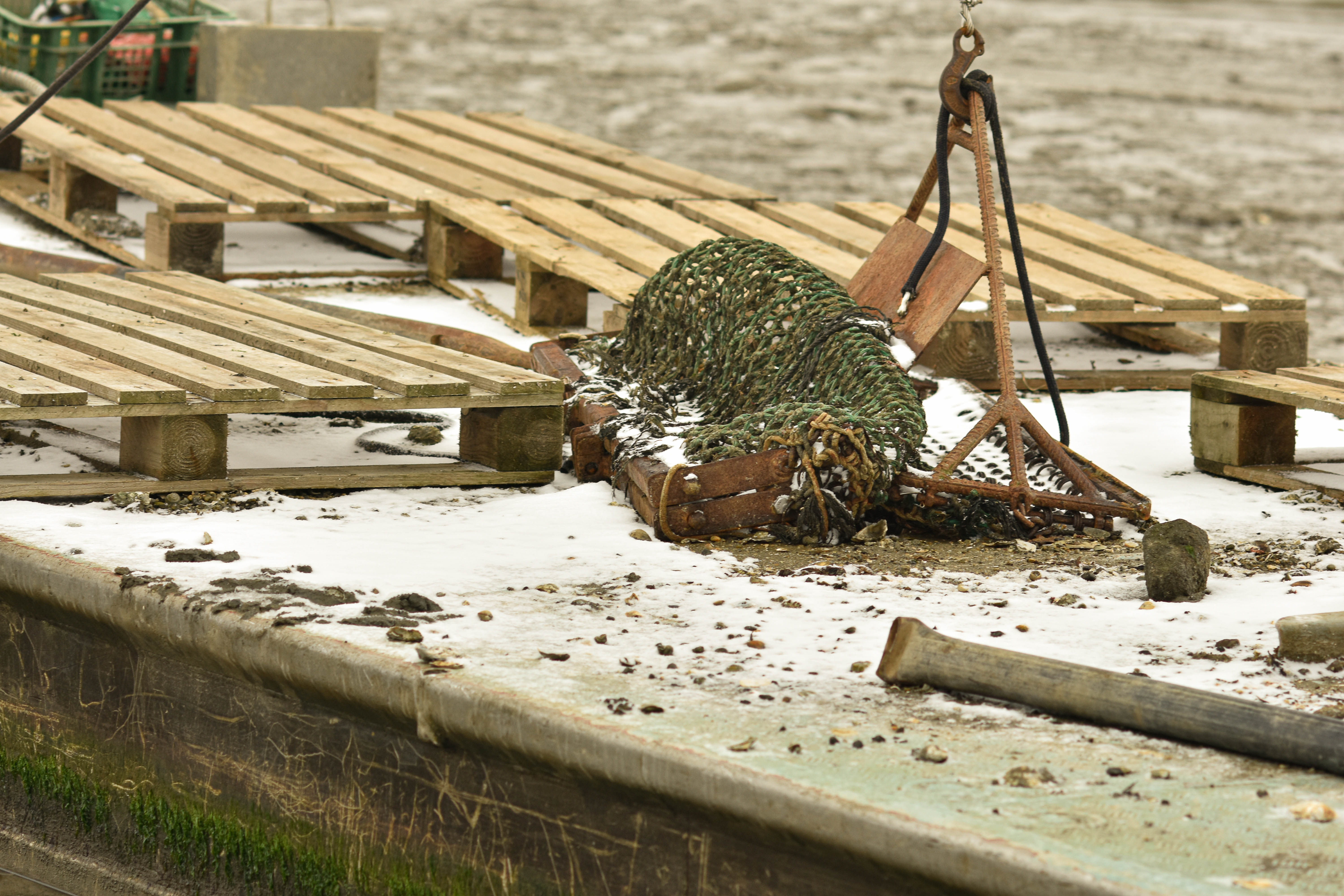 Nous ne voyons pas les parcs en entier, nous faisons les marées équipés de nos « cottes » (terme dérivé de cotte de maille, vu l’encombrement et le poids) et nous faisons semblant de savoir tenir le chaland contre le vent. Avec de l’eau au-dessus du nombril, nos pointes de pieds au sol, il est difficile de croire que, malgré tout l’équipement, nous fassions plus de poids qu’une ancre flottante. Ainsi, quand le patron nous crie « stop » ou bien « écarte », il y a un temps de réaction certain, entre l’erre du bateau que l’on freine, vaille que vaille, en serrant les dents, en se demandant qui du chaland ou de nos bras va l’emporter, et le vent qui tracte en sens toujours inverse, croirait-on. Quand enfin la manoeuvre a réussi (ou presque), nous avons chaud, l’eau de nos manches a coulé dans notre dos, nos pieds sont plantés dans la vase, et nous savons que nous n’avons que 10 secondes de répit avant la prochaine tentative de mouvement.