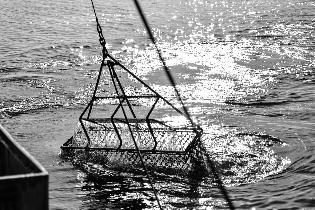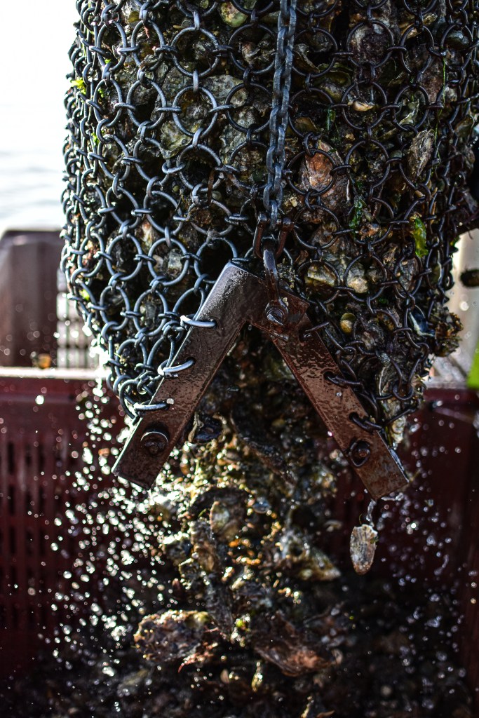 Seulement voilà. Un jour ou l’autre ces huîtres ont grandi et doivent être « levées », donc draguées. Le poor lonesome sea boy va repartir en mer, changer l’outil tracté par le chaland pour une drague, sorte de poche en maillage de fer, qui va gratter le sol pour ramasser les huîtres comme une main géante. Nous venons de remplacer la drague et elle travaille formidablement. Bien sûr, le talent du pilote est nécessaire pour sentir aux frémissements du bateau, le moment où la drague est pleine, savoir à la hauteur de niveau d’eau, quelle longueur de bout allonger pour la position sous-marine de la drague (trop court elle ne touche pas et ne ramasse rien, trop long elle va labourer le sol, l’abîmer et ramasser autant de vase que d’huîtres et autres coquillages), tout un art que je ne maîtrise absolument pas et c’est très bien comme ça.