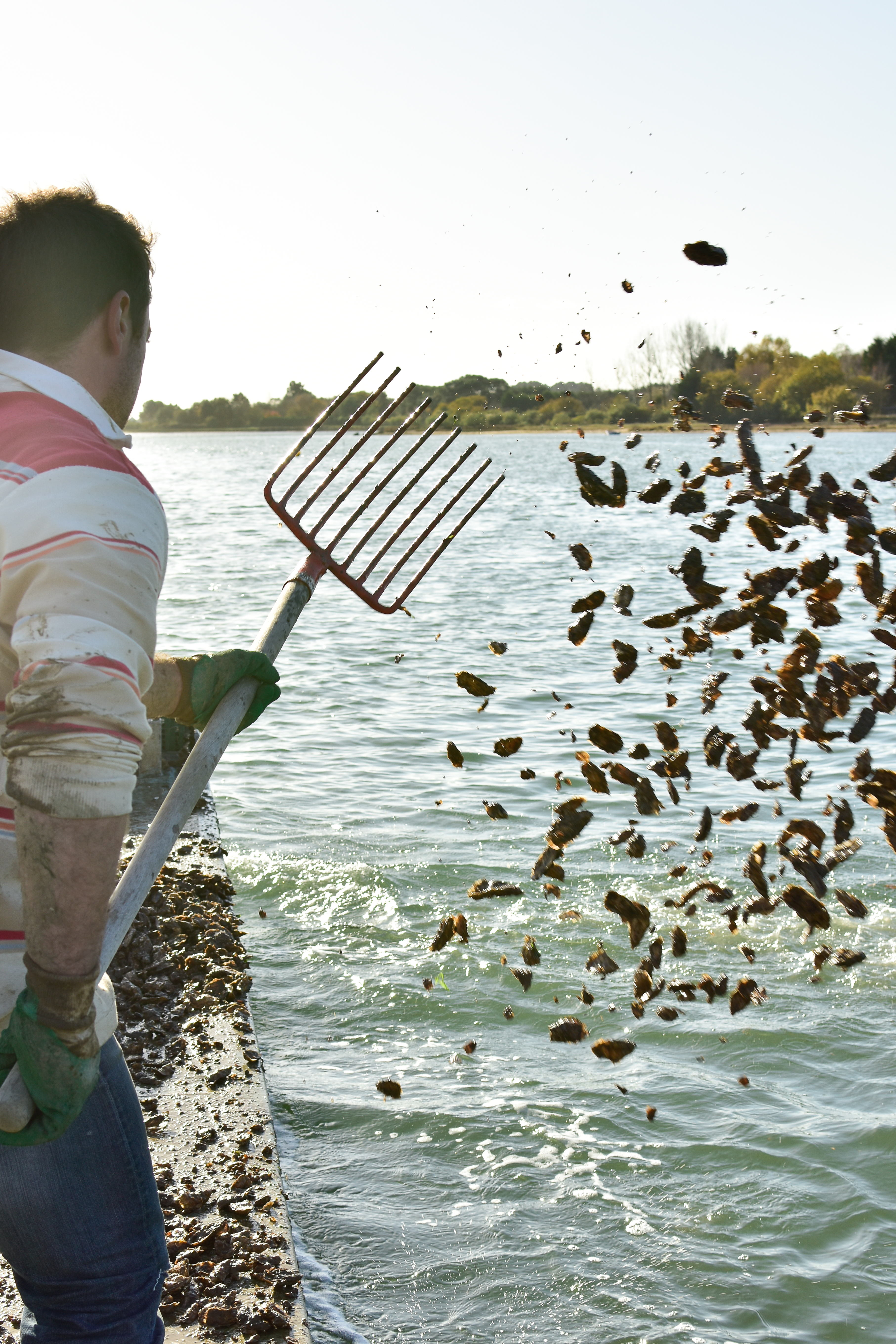Notre emplacement en amont de la rivière nous protège un peu mieux des dorades, qui n’ont pas besoin de remonter si haut avant de trouver pitance. Néanmoins, nous ne semons pas le naissain, ni les huîtres trop petites. Elles sont déjà bien formées et résistantes quand elles se retrouvent au contact du sol et des éléments.