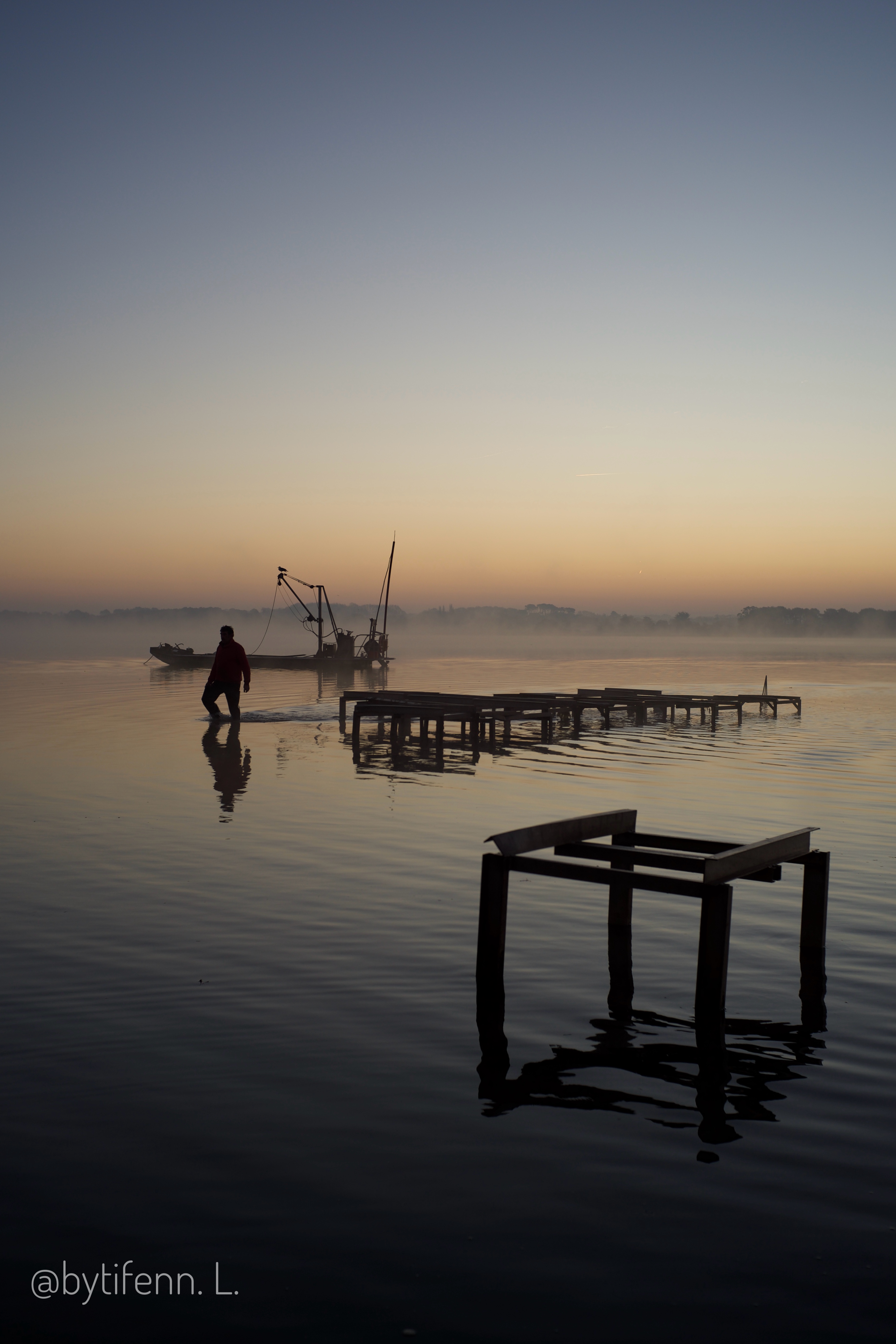 En ostréiculture, nous allons « à la marée » chaque jour. Quand c’est possible. Cela consiste à accompagner la mer en jusant (quand elle descend) pour accéder aux poches d’huîtres qui sont fixées sur les structures en fer à béton que l’on appelle « tables », puis à remonter en flot (quand la mer monte) puisque la marée va recouvrir les tables et que notre but n’est pas d’apprendre à nager.
